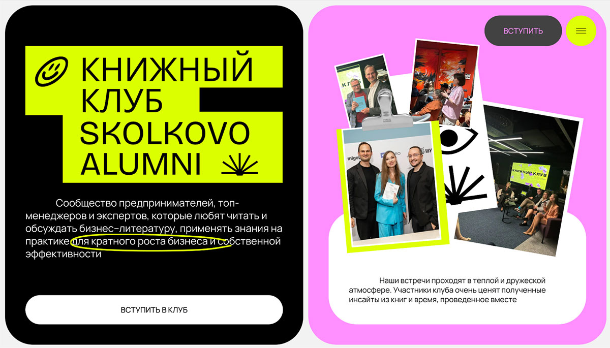 Участниками клуба могут быть только студенты и выпускники «Сколково», но каждый участник может пригласить одного гостя.